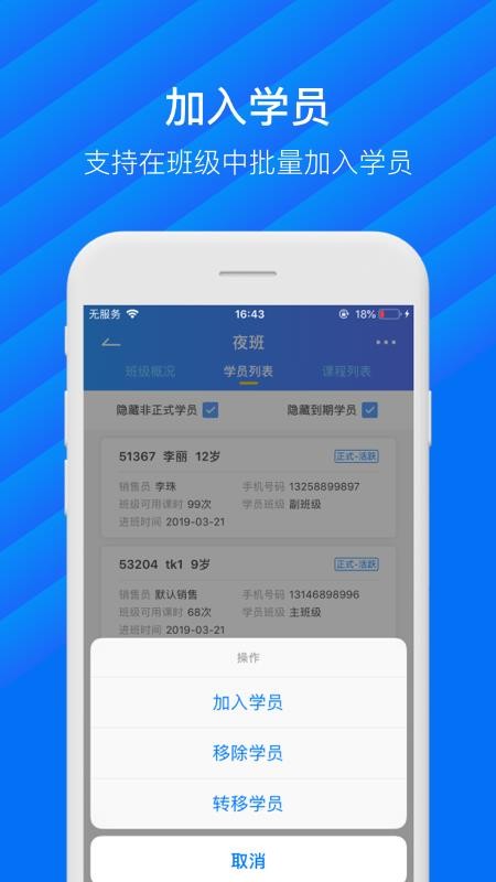 5、在这里,用户可以一键加入、移除或转移学员,并且能够清晰看到各学员信息;