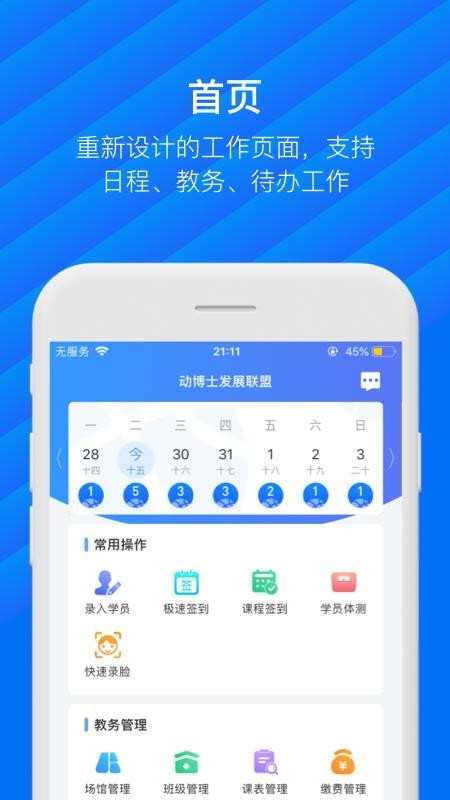 2、在首页中快速录入新的学员信息,在线进行签到,轻松管理各种教务