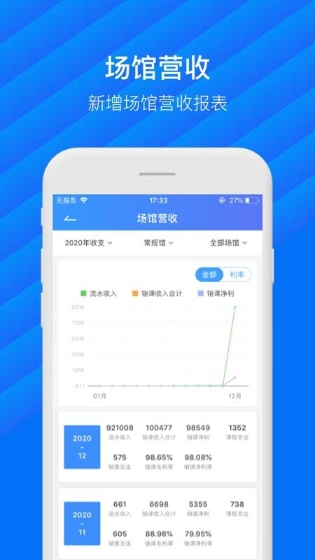 4、用户在软件中可以清晰看到场馆的营收信息,了解不同年份和月份的收入详情;