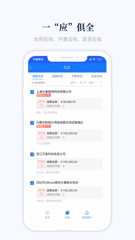 1、支持应收的类型多样,合同应收、开票应收、发货应收等,适用于各行业的应收场景;