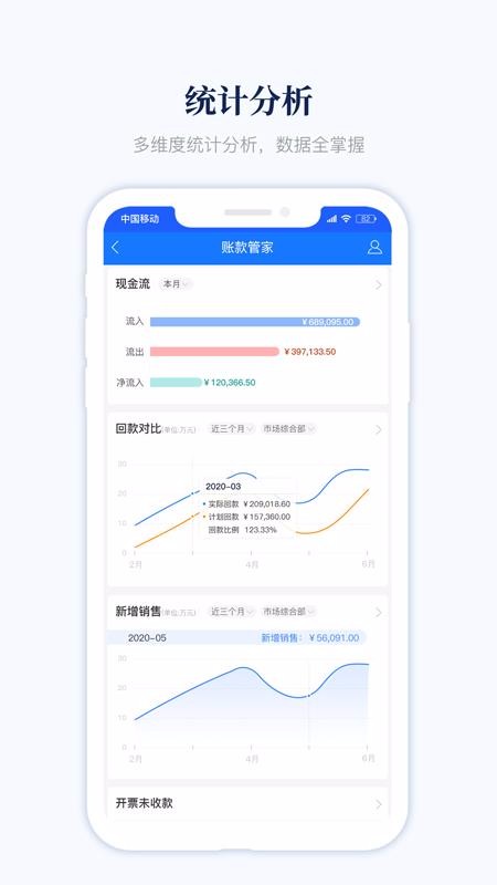3、自动从多维度进行统计分析,一手掌握各类数据,清晰查看账款详情;