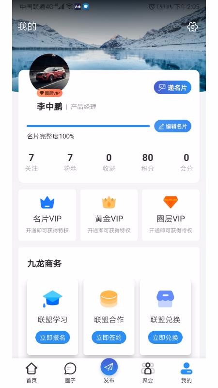 5、切换到我的主页查看个人数据,点击九龙商务中的联盟合作并立即签约