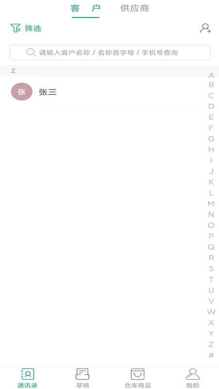 4、在这里,用户可以通过客户供应商的名称、首字母和手机号来进行搜索查询;