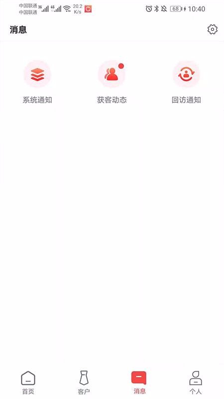 1、丰富的消息中心划分内容,里面设置了系统通知、获客动态以及回访通知图标;