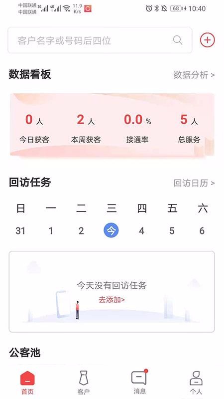 2、点击搜索栏搜索查找客户,或查看下面的回访任务安排