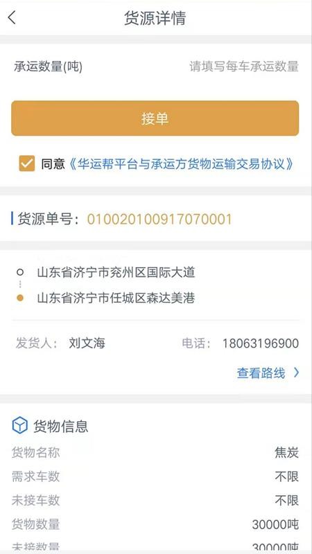 2、在首页中查看最新的各个货源信息,了解货源详细内容,一键接单