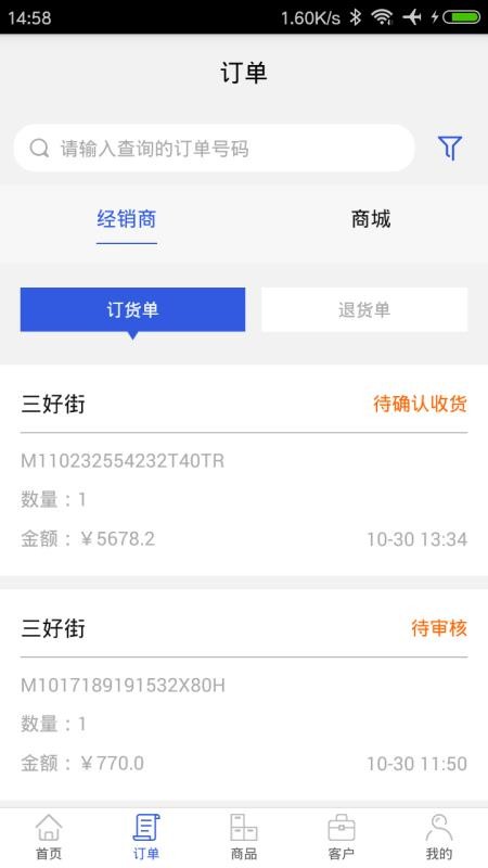 3、进入订单版块,查看各个经销商和商城的订货单和退货单,了解订单状态