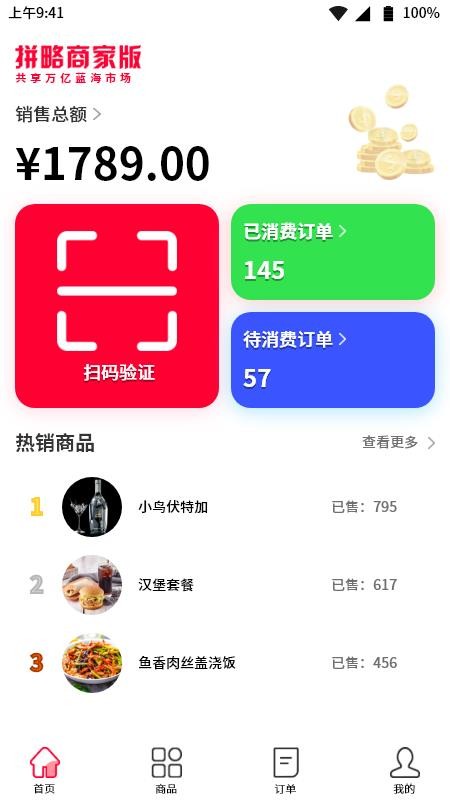 2、在首页中查看各个热销产品的详细销量信息,了解店铺的销售总额,一键进行扫码验证