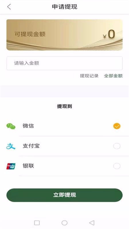 4、提供多种不同的提现方式,申请提现页面为用户提供了微信、支付宝以及银联三种提现方式;