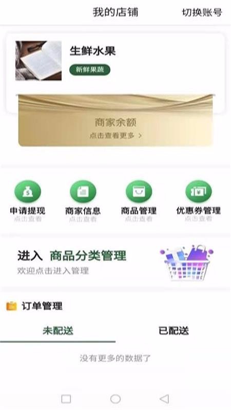 1、丰富的主页功能设置栏,这里有申请提现、商家信息、商品管理以及优惠券管理功能;