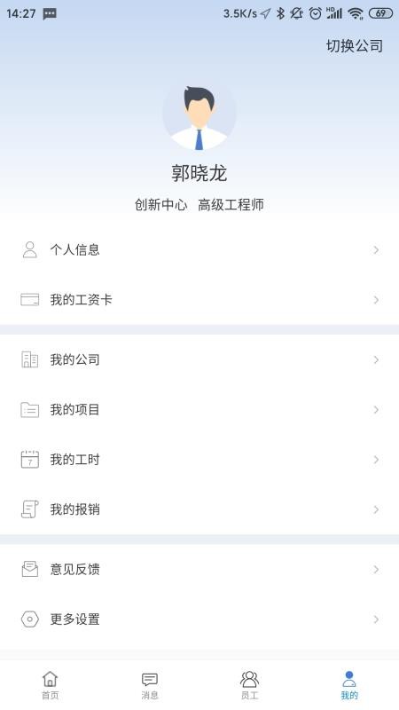 5、点击进入我的专区中,立即了解个人信息和工资卡,查看工时、项目的情况