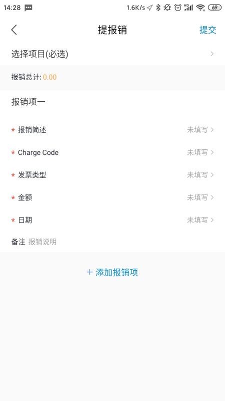 4、在报销页面,编辑消息的报销内容,实时提交报销信息
