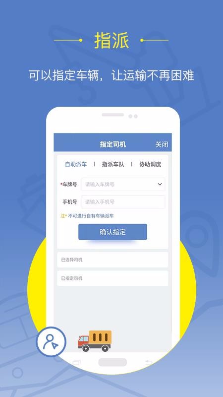 4、在线即可指派司机,包括自助派车、指派车队和协助调度三种类型;