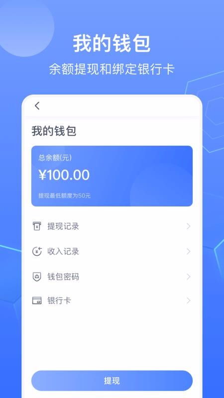 4、在我的钱包中,用户可以查看展示的提现记录、钱包密码、银行卡等功能