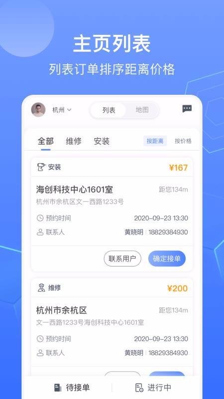 1、可以按照距离或价格排序订单,并选择订单查看详情介绍;