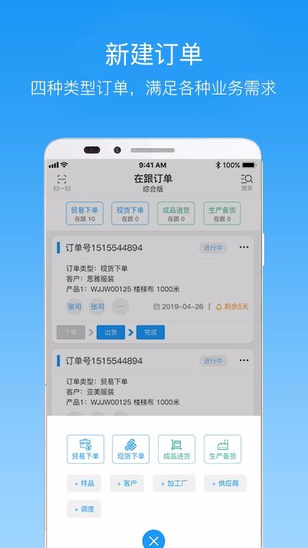 纺织超人管理版是专门为纺织行业提供的管理软件,通过订单管理、财务管理等形式,帮助企业提高管理的效率,也减少人工和成本,轻松实现移动和智能办公;所以,纺织行业的企业想要实现便捷办公,就可以通过该软件进行使用,而且平台提供的管理功能多样,涵盖了订单生产各流程,相应的系统提供了多种订单分类,可以帮助企业分类管理贸易下单、现货下单、成品进货、生产备货等方面的订单信息,也适应了各种业务需求;而且平台会自动统计企业的销售数据、订单数据等,可以让用户清晰查看销售情况,便捷掌握利润、成本等数据,更加便捷的管理企业。