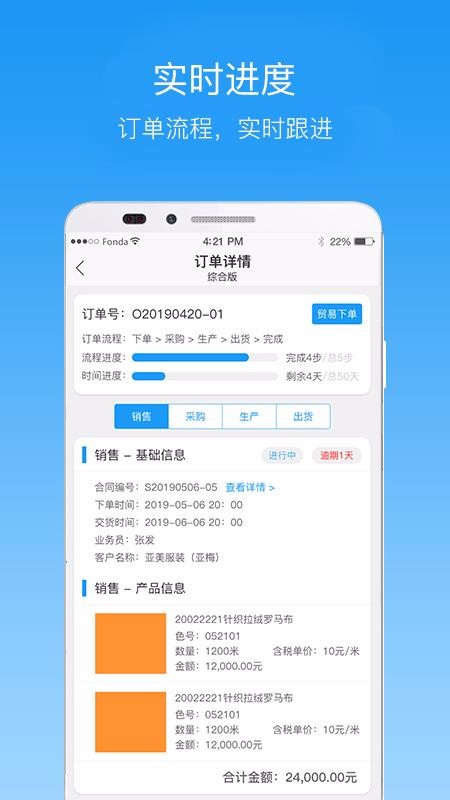1、实时跟进订单流程,便捷了解订单进度,也清晰查看时间进度;