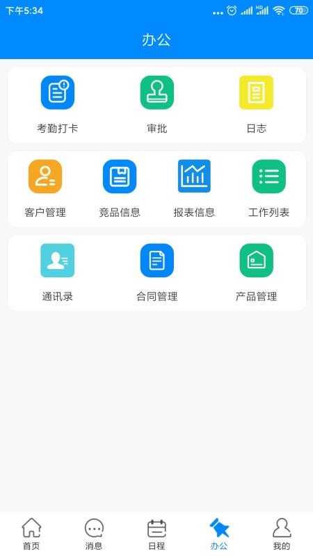 4、进入办公版块,快速进行考勤打卡,在线审批各种申请,轻松管理各个客户和产品
