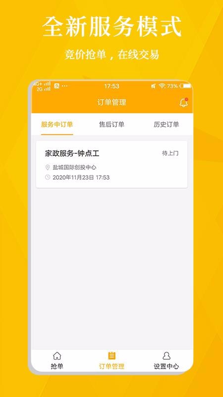 1、简洁清晰的订单管理中心,这里划分了服务中订单、售后订单和历史订单多种状态栏目;