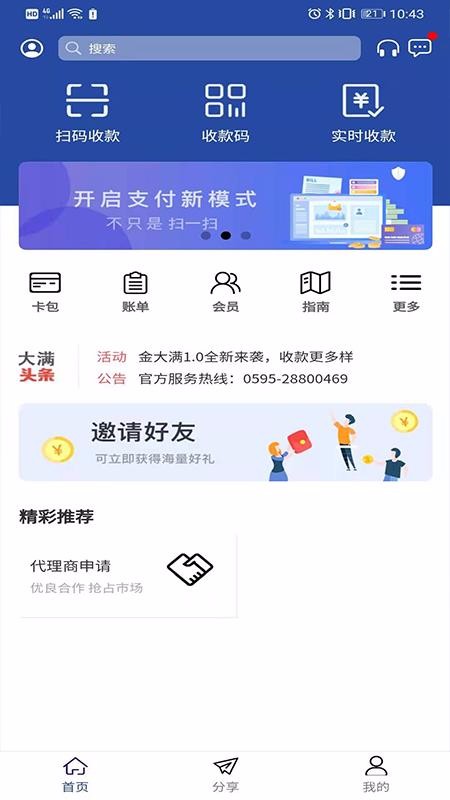 金大满是一个商户收银工具,帮助登录的用户便捷的完成收银操作,并且该平台也提供了多种收银途径,无论是扫码收款,还是收款码,都可以实现实时收款,而且移动收款操作更加便捷;所以,有需求的用户可以下载该软件进行使用,并且通过平台的认证后,可以更好的享受产品各项服务,而且平台也为用户的收款提供保障,确保账户资金和交易安全,因此用户可以放心下载该软件并使用;而且通过简洁的界面设计,用户可以快速上手进行相应的操作,虽然功能多样,但分布简单,使用也简单,全面的保障了用户的使用体验。