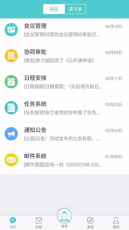 4、分类推送了各类新消息,包括会议消息、协同审批、任务系统、通知公告等消息内容;