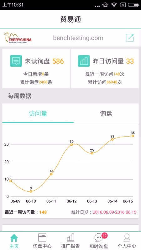 贸易通是一个电子商务经营状态监控平台,以数据化的形式统计展示了商家营销过程的商品访问量、商品销售量等多种内容;上面开设了数据总览主页,还有询盘中心以及推广报告数据统计中心,从主页能对整体的数据一目了然,这些数据版块中展示了各种未询盘的数量信息内容,同时还有每周数据统计展示图,该图将相应的访问量和询盘数据进行趋势化的统计,通过曲线将这些数据连接起来,让用户能对整体的数据走势更加清晰明了;该软件以大数据形式统计了海内外的商贸信息内容,每天都能从平台上看到国内外众多商品贸易访问情况。