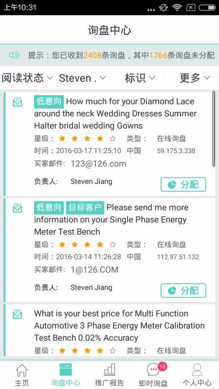 4、一键分配询盘信息内容,使用询盘中心的分配功能可以将其中的询盘分配出去;