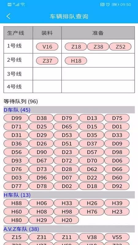 4、一目里偶然的车辆排队查询页面,里面按照不同的车队划分展示了相应的车辆序号;