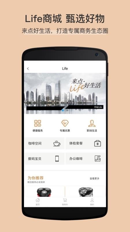6、新增LIFE商城功能,包含便捷服务、生活、购物等模板,为楼宇白领提供商务生活新体验。