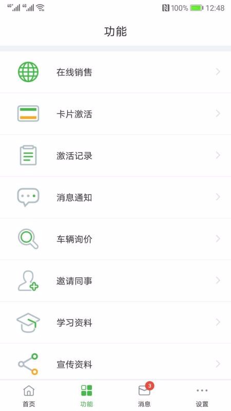 2、丰富的功能服务,平台为用户提供了在线销售、卡片激活和车辆询价等功能;
