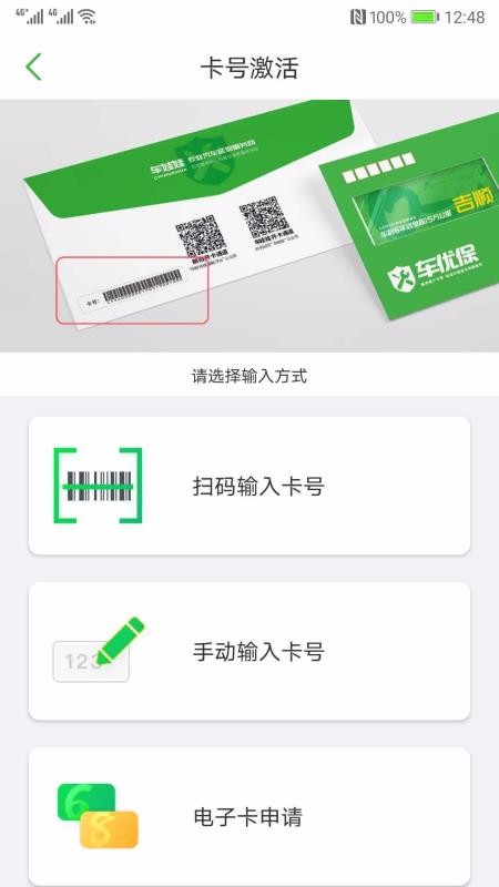 5、提供两种卡片激活方式,卡号激活页面同时为用户提供了扫码输入卡号和手动输入两种方式;