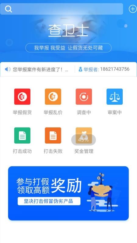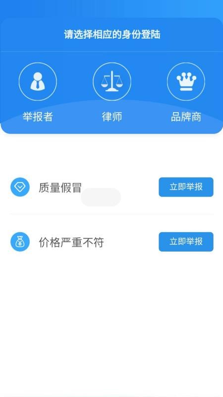 查卫士app是一款为用户提供知识产权保护服务的软件,在这里,拥有举报者、律师、品牌商三种身份,用户可自由的根据实际情况进行选择登陆,登陆成功后,用户就可以在线举报各种假货以及乱价的现象,轻松填写信息就能完成举报操作,再也不需要去到线下的举报部门,节约了用户大量的时间;同时,在用户举报后,会立即的开始调查,并将调查和审案的进度直观的展现在用户的面前,可快速的进行查看,轻松就能知晓各种进度信息,再也不用遭受一遍遍跑到举报部门询问结果的窘境,带给了用户极大的便利;有需要的朋友抓紧时间下载体验吧。