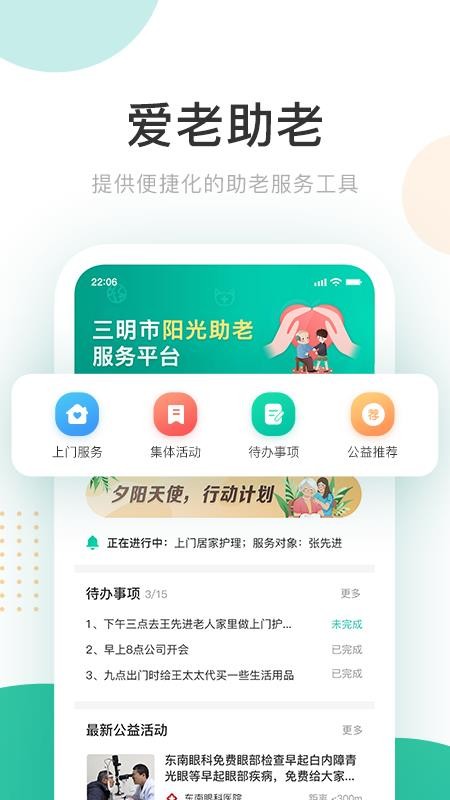 阳光助老app是一款为各个助老服务人员打造的助手软件,让用户能够更加便捷的为老人们提供养老服务,帮助老人享受更优质的晚年生活;用户在软件中能够清晰看到自己的各种待办事项内容,从而能够及时完成自己的各项任务内容,帮助老人改善身体状况和生活环境;通过软件用户可以找到多种类型的活动内容,快速参与到不同的公益活动中,构建更加美好的社会;在这里用户还可以看到各个长者的详细信息,从而能够根据长者实际情况提供更加精准的服务;快下载这款软件试试吧,轻松为长者们提供各种养老服务,改善长者生活体验。