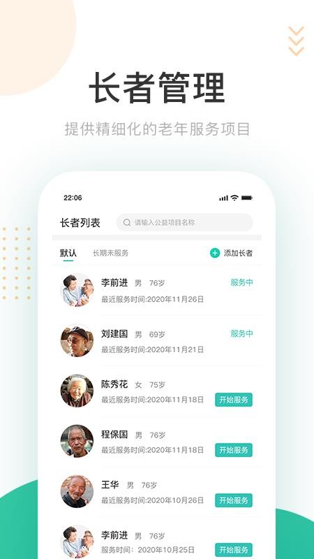 2、在这里,用户能够清晰看到各个长者的最近服务时间,一键开始为长者服务;