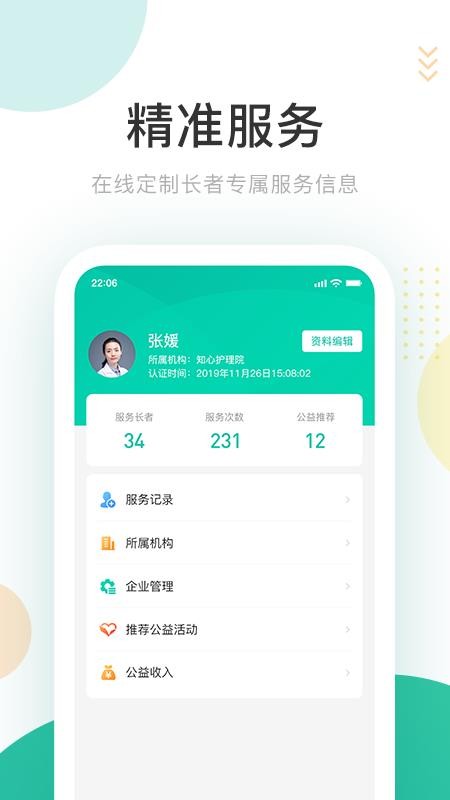5、用户在软件中能够清晰看到自己的服务长者数量、服务次数和公益推荐次数;