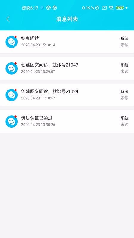 2、拥有丰富的信息内容列表,消息列表中展示了结束问诊、资质认证审核等反馈信息;