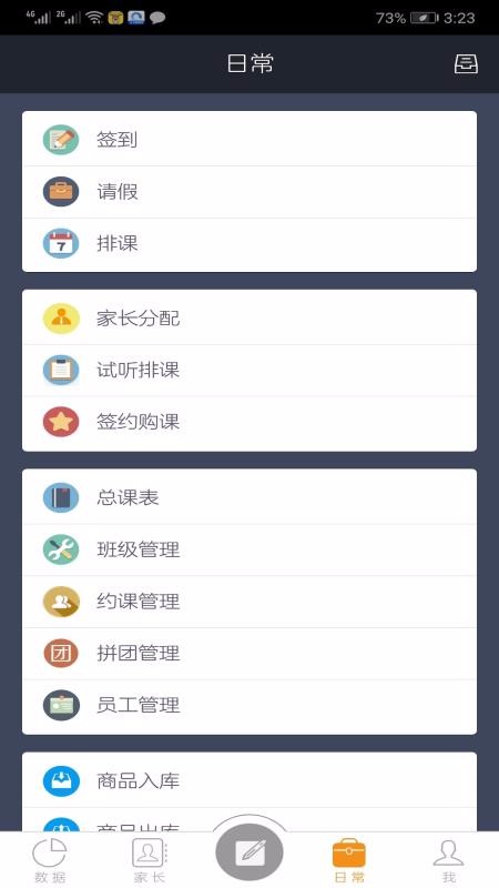 5、进入日常页面后,即可浏览提供的管理功能,比如签到、请假、家长分配等