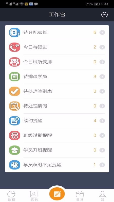 4、提供了续约提醒、班级过期提醒、学员升班提醒等,也标注了提醒数量;