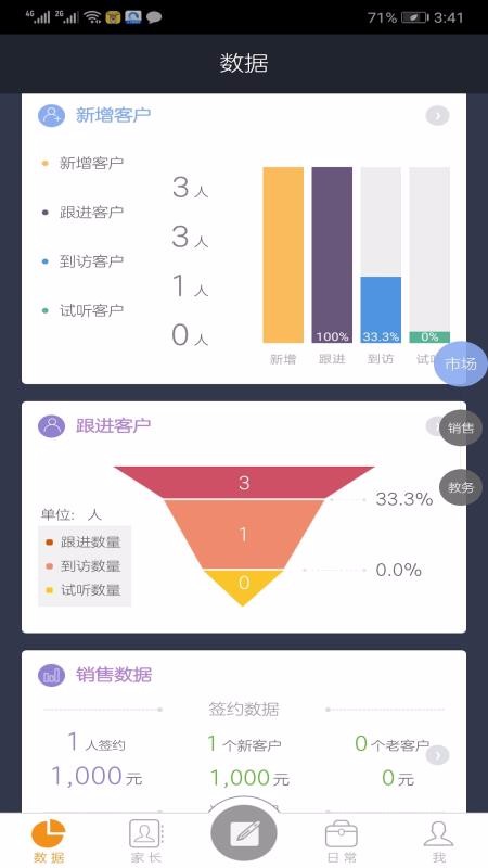 2、拥有贴心的数据统计功能,自动统计了客户数据、销售数据等,分类展示数据信息;