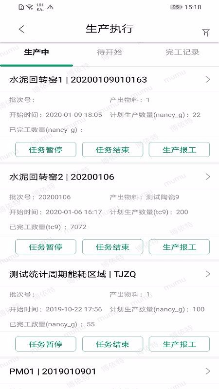 6、丰富便捷的生产执行操作工具,该生产中热风无上设置了任务暂停、任务结束以及生产报工标签;