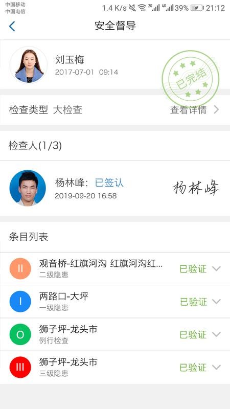 3、进入安全督导版块,查看检查人信息和检查条目内容,了解检查结果