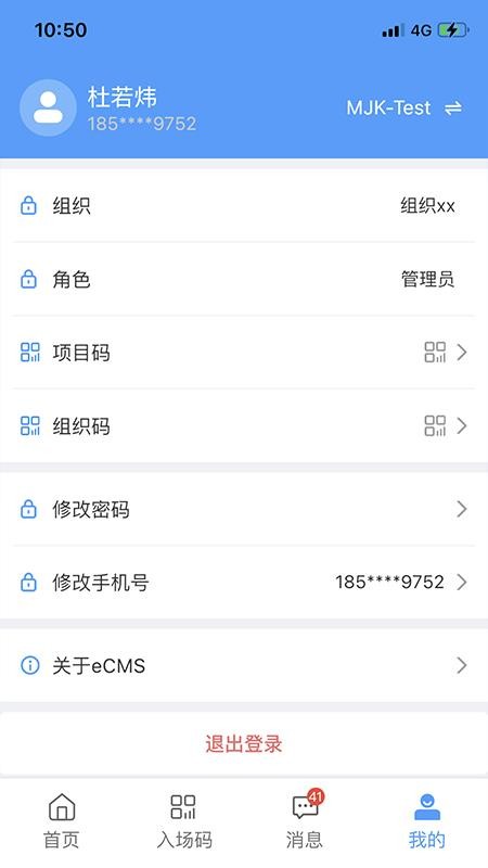 5、打开个人中心,查看自己的组织和角色信息,一键修改密码和手机号