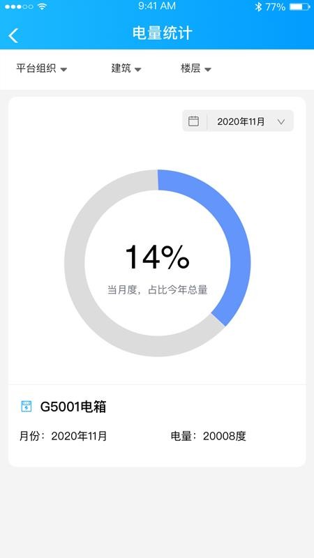 5、提供筛选功能,用户可以根据平台组织、建筑和楼层来对电量统计内容进行筛选;