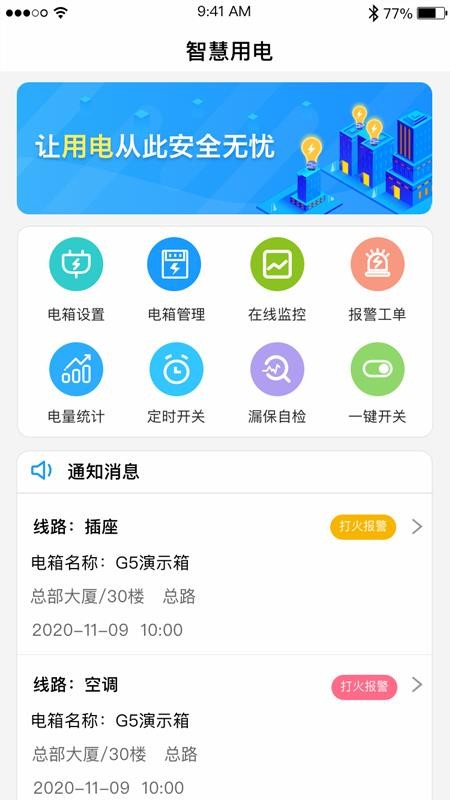 2、在首页中查看最新的通知消息内容,了解报警类型和报警电箱位置,快速处理