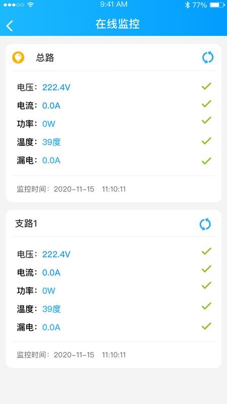 3、进入在线监控版块,实时监控总路和各个支路的电压、电流和功率等信息