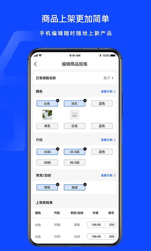 2、应用中有商品规格编辑功能,用户可以在线编辑各个商品的规格,方便快捷;