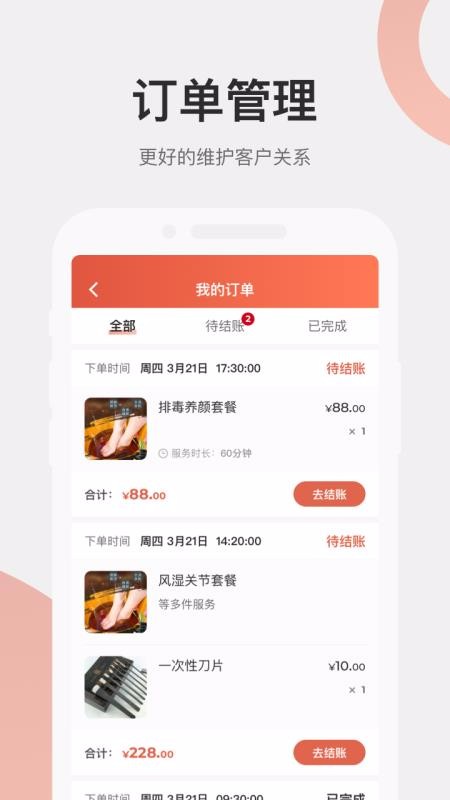 2、查看个人的订单,知道订单的情况,订单管理更方便,便于客户快速结账,给你更好的订单管理体验;