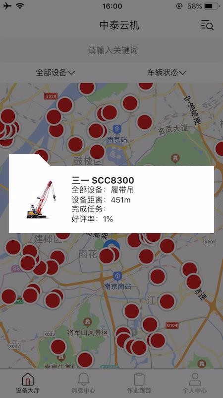 4、在地图上寻找吊车设备服务,可以从首页设备大厅列表切换到地图查看附近设备;