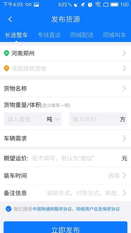 3、点击发布,快速发布各种货源、车源和线路信息,轻松运输货物