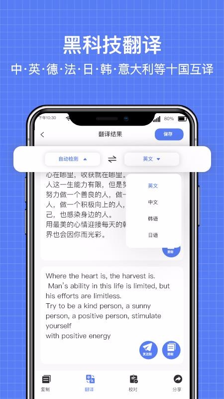 4、切换到翻译页面快速选择语言,马上翻译并查看翻译内容后复制